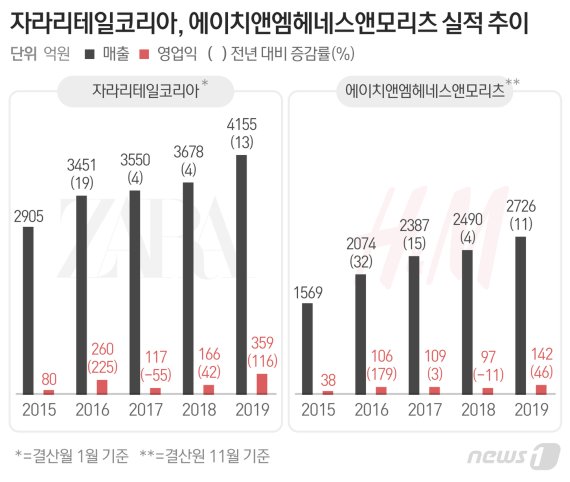 자라뿐만 아니라 국내에서 스웨덴 패션 기업인 H&M을 운영하는 에이치앤엠헤네스앤모리츠는 지난해 회계연도(2018년 12월 1일~2019년 11월 30일) 기준으로 142억원의 영업이익을 기록했다. 전년(97억원) 대비 46% 가량 늘어난 수치다. 매출도 약 9% 오른 2726억원을 기록한 것으로 집계됐다.