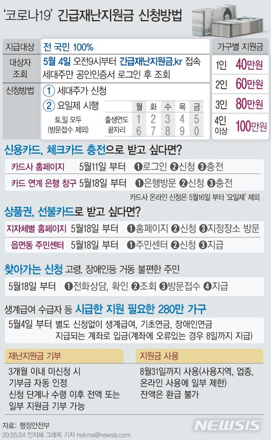 긴급재난지원금 대상은 전국 2171만 가구다. 1인 가구는 40만원, 2인 가구는 60만원, 3인 가구는 80만원, 4인 이상 가구는 100만원을 각각 받을 수 있다. 저소득 286만 가구는 지난 4일부터 현금으로 지원받았다.