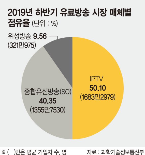 KT와 KT스카이라이프를 합산한 가입자 수는 1059만명, LG유플러스와 LG헬로비전을 합산한 가입자 수는 837만명으로 유료방송 시장에서 각각 31.52%와 24.91%의 시장점유율을 차지했다.