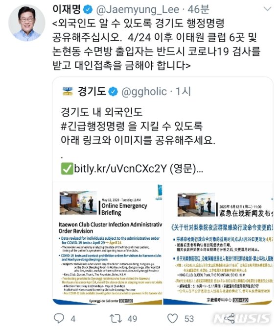 이재명 지사도 SNS 채널 트위터 등을 활용해 "외국인들도 행정명령 내용 숙지해 조속히 검사받을 수 있도록 널리 알려 주시기 바랍니다"는 내용과 "외국인도 알 수 있도록 경기도 행정명령 공유해주세요, 4월24일 이후 이태원 클럽 6곳 및 논현동 수면방 출입자는 반드시 코로나 19 검사를 받고 대인 접촉을 금해야 합니다"라는 행정명령을 안내하면서 영어, 중국어 행정명령 안내서를 함께 공유, 외국인 자발검사를 이끌어 냈다.
