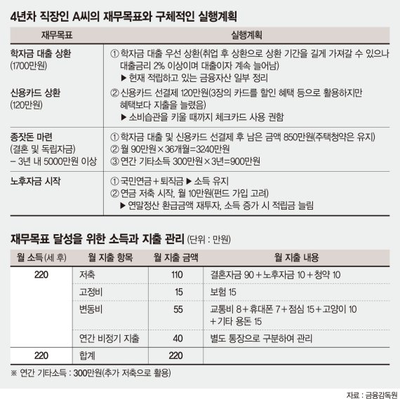 금감원은 A씨에게 1700만원인 학자금 대출을 상환할 것을 주문했다. 취업을 하면서 상환기간은 길게 가져갈 수 있지만 대출금리가 2% 이상인 데다 대출이자가 계속 늘어나기 때문에 부담이 된다. 이를 위해 현재 적립하고 있는 금융자산 일부를 정리할 것을 권고했다. 소비 습관을 키울 때까지 신용카드 대신 체크카드 사용을 조언했다.