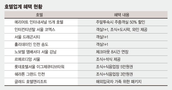 이에 따라 '호텔 객실 1+1'이라는 파격적 상품까지 등장했다. 한 호텔업계 관계자는 "남는 게 있느냐는 얘기도 있지만 당장 호텔 문을 닫을 수는 없는 만큼 되도록 많은 혜택을 넣어 내국인 수요라도 잡기 위해 노력하고 있다"고 말했다.
