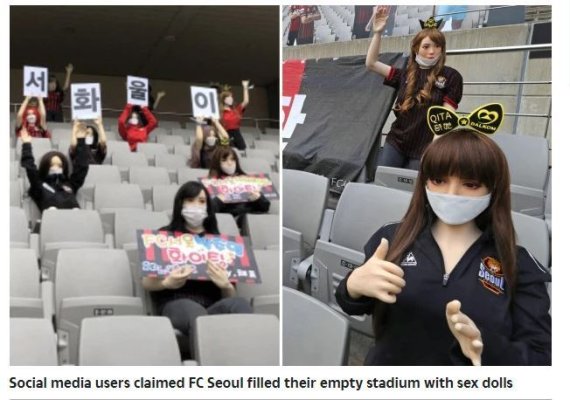 러시아 매체 'RT'도 "벨라루스의 디나모 브레스트 클럽은 홈 경기에 실제 팬을 대신해 마네킹을 준비했다"며 "반면 서울은 성인용품점에서 판매하는 섹스돌로 보이는 마네킹이 관중석에 앉아 있었다. '플라스틱 팬'이라는 개념을 들어봤지만 서울은 완전히 새로운 차원이었다"고 꼬집었다.