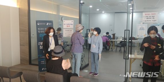 [용인=뉴시스]이준구 기자 = 경기 용인시 기흥구 동백3동이 20일 관내 노인주거시설인 '스프링카운티 자이’를 방문, 정부재난긴급지원금 신청을 대신 도와주는 등 맞춤형 민원서비스를 실시했다.