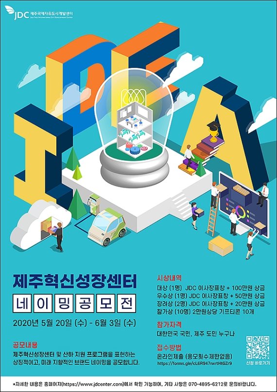 [제주=좌승훈 기자] 제주국제자유도시개발센터(JDC)는 6월3일까지 지속가능한 브랜드 이미지 창출과 경쟁력 확보를 위한 ‘제주혁신성장센터 네이밍 공모전’을 개최한다