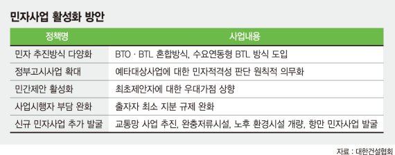 이와 더불어 '정부고시사업 확대'도 절실하다. 현재 민간투자시장은 민간제안사업에 의존해 돌아가고 있는 실정이다.