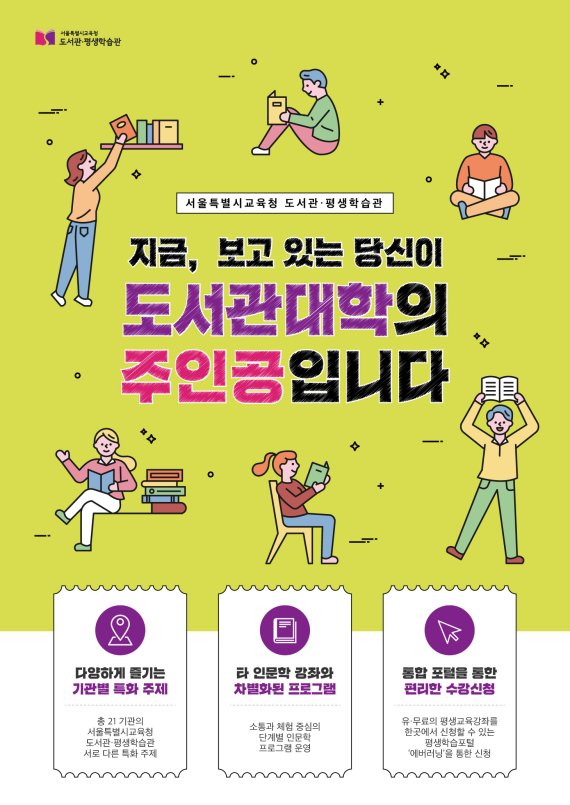 서울시교육청은 26일 서울시와 교육협력사업인 '서울교육형 도서관대학' 인문강좌 프로그램을 6월부터 재개관한다고 밝혔다. 6월 도서관 대학은 고척도서관 '영화로 읽는 라틴아메리카'를 시작으로 △도봉도서관 '아트인문학으로 만나는 스페인' △송파도서관 '근현대건축과 도시의 흐름과 풍경들' 등 총 17개 주제의 프로그램으로 운영될 예정이다.