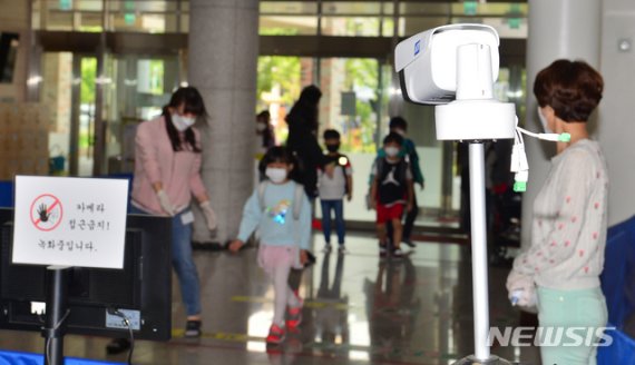 교문을 지나 학교로 들어선 학생들은 열화상 카메라로 체온을 체크한 뒤 교사의 안내에 따라 하나 둘 씩 교실로 들어섰다. 아이들은 입구에서 1m이상 간격을 유지하며 기다렸다가 발열검사와 손소독을 한 뒤에야 입실할 수 있었다.