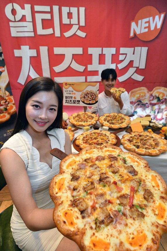한국피자헛 홍보도우미들이 1일 오전 서울 국제금융로 피자헛 여의도중앙점에서 신제품 '얼티밋 치즈포켓'을 선보이고 있다. 사진=서동일 기자