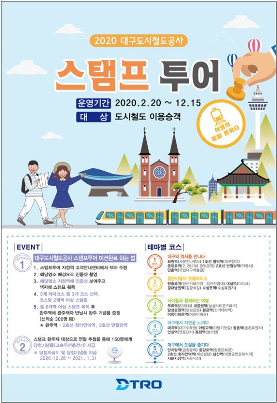[파이낸셜뉴스 대구=김장욱 기자] 대구도시철도공사는 '코로나19'로 운영이 주춤했던 '2020 도시철도 스탬프투어'를 이달부터 본격 운영한다고 2일 밝혔다.