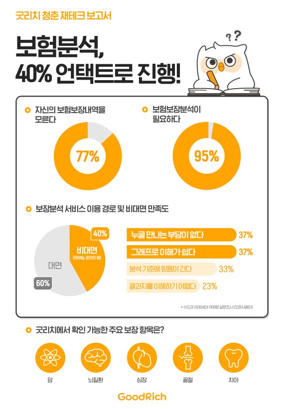 4일 인슈어테크 플랫폼 굿리치가 모바일 리서치 기관 오픈서베이에 의뢰해 20~30대 수도권 직장인 1000명을 대상으로 재테크 설문조사를 진행한 결과에 따르면, 보험 영역에서 언택트 트렌드가 확실하게 드러났다.