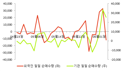 다음 표는 동종목의 외국인, 기관의 일별 순매수량을 나타낸 것이다.