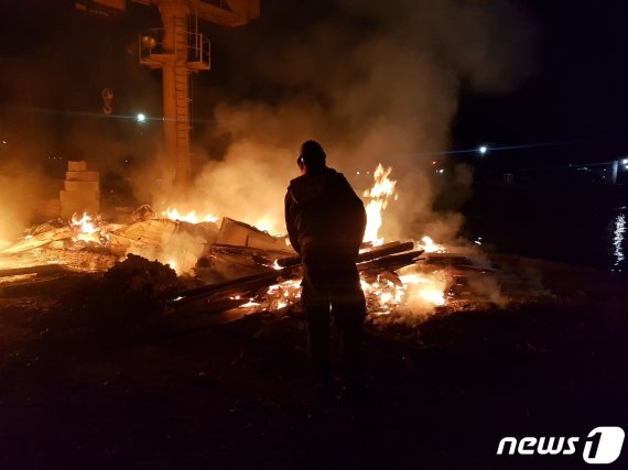 불은 방파제에 쌓아놓은 목재 더미 등을 태우고 출동한 해양경찰관에 의해 40여 분만에 진화됐다.