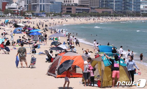 (부산=뉴스1) 박채오 기자 = 지난 1일 안전개장(부분개장)한 이후 첫 주말인 7일 부산 해운대해수욕장은 무더위를 피하기 위한 나들이객들로 북적였다.