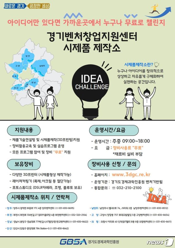 시제품 제작소는 진흥원에서 운영하는 경기벤처창업지원센터(고양, 남양주, 부천, 성남, 양주, 의왕) 6개소와 Station-G(안산) 창업공간 등 총 7곳에 마련돼 있다.