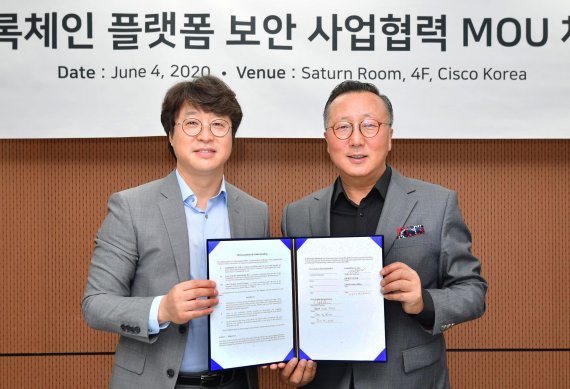 박재현 람다256 대표(왼쪽)와 조범구 시스코 대표가 지난 4일 블록체인 플랫폼 보안 사업협력을 위한 MOU 체결 후 기념촬영을 하고 있다. 람다256 제공