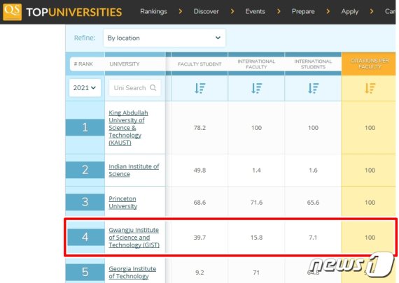 1위는 지난해와 동일하게 사우디아라비아의 카우스트(킹압둘라과학기술대학교), 2위는 인도 과학원, 3위 미국 프린스턴대학교가 차지했고 지스트(GIST·Gwangju Institute of Science and Technology)가 4위에 랭크됐다.