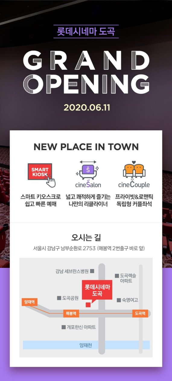 개관을 기념해 6월 13일까지 영화관을 방문하는 고객을 대상으로 오픈 기념 시사회도 개최한다. 이번 시사회에서는 영화 ‘침입자’ ‘결백’ 등 최신 개봉 및 인기작들과 ‘오페라 인 시네마’ 6월 작품 ‘카르멘’을 음악평론가 이용숙의 해설과 함께 만나볼 수 있는 GV 행사까지 무료로 진행된다.