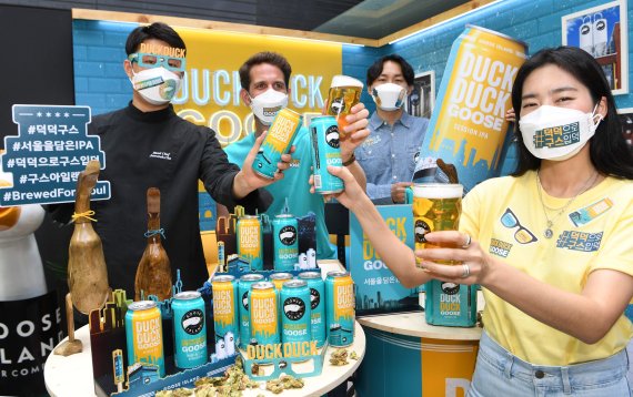 IPA맥주 브랜드 구스아일랜드는 11일 서울 역삼로 '구스아일랜드 브루하우스 서울'에서 '덕덕구스 세션 IPA' 500ml 캔 제품 출시 행사를 열었다. '덕덕구스'는 정통 IPA 맥주의 쓴맛은 줄이고 파인애플, 복숭아 등의 과일향을 더한 것이 특징이다.