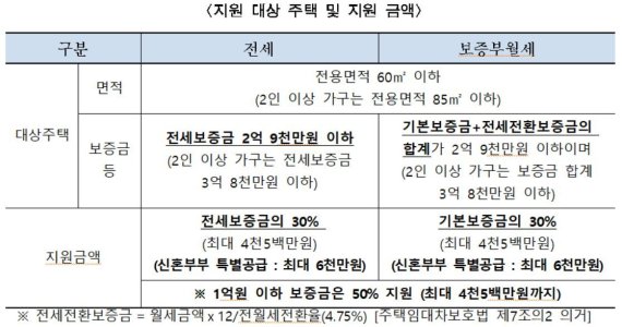 지원 대상 주택은 순수 전세주택과 보증부월세주택이다. 보증금 한도는 1인 가구의 경우 순수 전세의 전세금 또는 보증부월세의 기본보증금·전세전환보증금 합이 2억9000만원 이하여야 한다. 2인 이상의 가구의 경우 최대 3억8000만원 이하의 주택이 그 대상이다.
