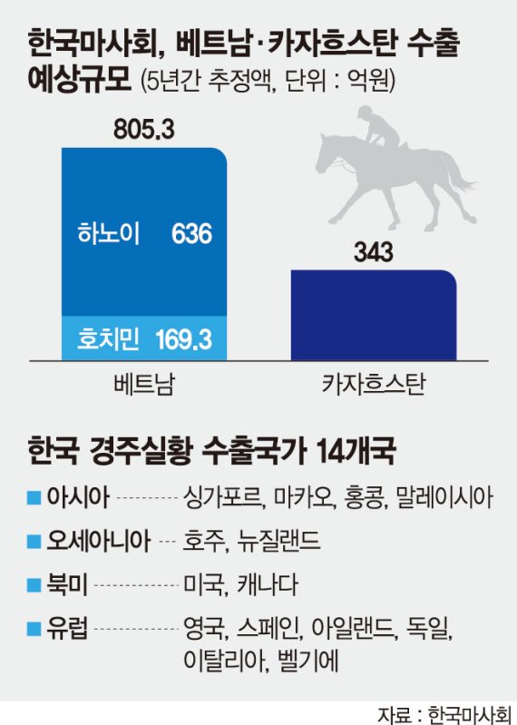 마사회는 지난해 베트남 호치민 경마장에 경마시행 및 발매운영 자문 등을 추진했다. 최근 베트남은 불법도박시장을 타파하고 자국의 세수 확대를 위해 경마, 스포츠베팅을 합법화하는 정책을 적극적으로 검토 중이다. 마사회는 약 35억원 규모의 계약을 따내기 위해 협상을 진행하고 있다. 계약이 체결되면 역시 국내 중소기업들과 함께 진출할 예정이다. 2024년까지 1000억원 규모의 경마 운영 시스템과 국내 중소기업의 첨단 장비가 카자흐스탄과 호찌민, 하노이에 수출될 전망이다.