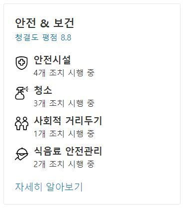 각 숙박업소의 안전시설, 청소, 사회적 거리두기, 식음료 안전관리 등 네 가지 카테고리의 정보를 제공한다.