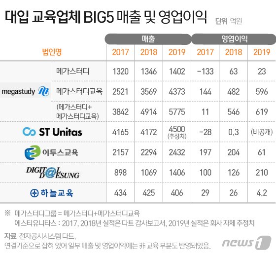 19일 입시 업계와 금융감독원 전자공시시스템 등에 따르면 메가스터디(메가스터디+메가스터디교육)가 지난해 매출 6000억원에 근접하며 업계를 선도하고 있다. 에스티유니타스는 지난해 4500억(추정치)를 기록하며 빠르게 성장을 이어가고 있다. 이투스교육과 디지털대성 역시 지난 3년 동안 매출 성장세를 이어가고 있다. BIG5 기업 중 하늘교육만 3년 동안 매출이 감소했다.
