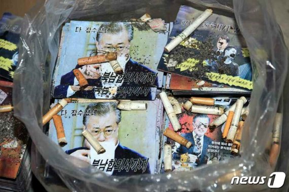 신문은 특히 문재인 대통령의 얼굴이 담긴 삐라에 담배 꽁초 등 쓰레기를 넣은 뭉치를 공개하면서 비방 의도를 노골적으로 드러냈다. 컵을 들고 무언가 마시는 문 대통령 사진에는 '다 잡수셨네…북남(남북)합의서까지'라는 문구를 새겼다.