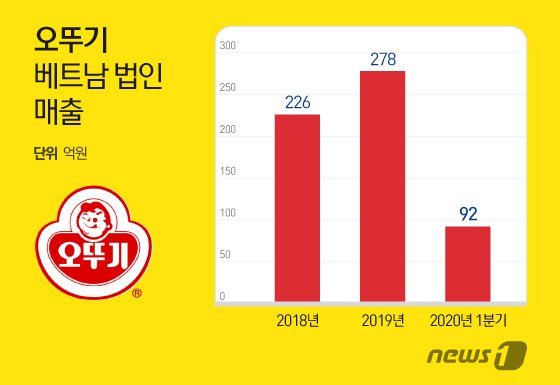 22일 업계에 따르면 오뚜기 베트남 법인 지난해 매출은 전년(226억원) 대비 23% 상승한 278억원을 기록했다. 올해 1분기도 매출 92억원을 달성하며 순항하고 있다.
