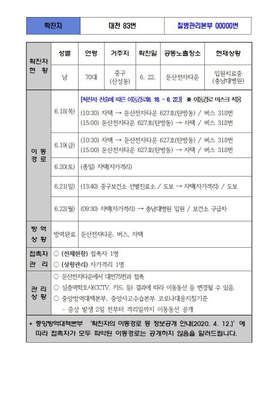 83번 확진자 산성동 거주 70대 남성으로 둔산전자타운에서 75번 확진자와 접촉했으며, 지난 20일부터 자가 격리중 확진 판정됐다. 84번 확진자는 성남동 거주 50대 남성으로 탄방동 둔산전자타운 내 사무실에 지난 17일 방문, 75·79번 확진자와 접촉한 것으로 확인됐다.