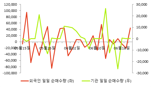 다음 표는 동종목의 외국인, 기관의 일별 순매수량을 나타낸 것이다.