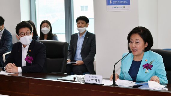 그린 중소벤처기업의 혁신성장을 위한 환경부와 중소벤처기업부 간의 업무협약식이 26일 서울 진흥로 한국환경산업기술원에서 열려 박영선 중소벤처기업부 장관이 발언하고 있다. 사진=서동일 기자