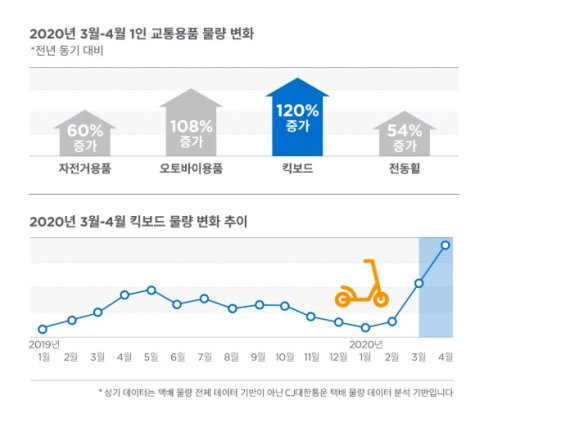불특정 다수가 이용하는 대중교통 대신 ‘1인 교통수단’인 킥보드 택배 물량은 전년 동기대비 120% 증가했다. 3월 킥보드 물량은 고강도 거리두기 직전인 2월 대비 3배 이상 늘었다. 자전거 용품 60%, 전동휠 54% 증가 등 개인 교통 상품 증가세도 두드러지게 나타났다.