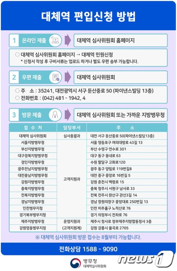대체역 편입을 희망하는 사람은 입영일 혹은 소집일 5일 전까지 필요 서류를 대전 서구 소재 '대체역 심사위원회' 또는 가까운 지방병무청에 제출하면 된다. 직접 방문 외에도 우편, 팩스, 인터넷으로 신청할 수 있다.