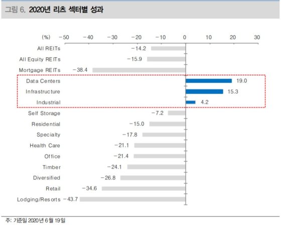 올해 상반기 코로나19 타격으로 미국 리츠는 전년 대비 14.2% 하락했다. 임대료 인하, 배당금 축소, 신용 리스크 확대 위험이 주가에 상당부분 반영됐다는 진단이다. 섹터별로 차이가 컸다. 감염병 노출도가 높은 숙박·리조트(-43.7%)와 리테일(-34.6%)의 하락 폭이 상대적으로 큰 가운데 언택트(비대면) 수혜가 예상되는 데이터센터(19.0%), 인프라(15.3%) 등은 2·4분기에 신고가를 경신하기도 했다.