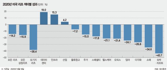 올해 상반기 코로나19 타격으로 미국 리츠는 전년 대비 14.2% 하락했다. 임대료 인하, 배당금 축소, 신용 리스크 확대 위험이 주가에 상당부분 반영됐다는 진단이다. 섹터별로 차이가 컸다. 감염병 노출도가 높은 숙박·리조트(-43.7%)와 리테일(-34.6%)의 하락 폭이 상대적으로 큰 가운데 언택트(비대면) 수혜가 예상되는 데이터센터(19.0%), 인프라(15.3%) 등은 2·4분기에 신고가를 경신하기도 했다.