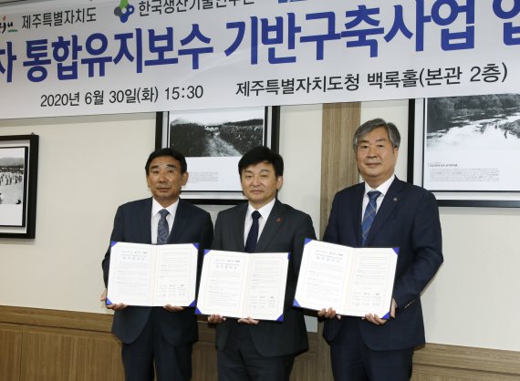 제주도는 30일 오후 3시30분 도청 백록홀에서 한국생산기술연구원(원장 이낙규)·㈔한국자동차검사정비사업조합연합회(회장 양승용)와 전기차 통합 유지·보수 기반 구축에 따른 업무협약을 체결했다.