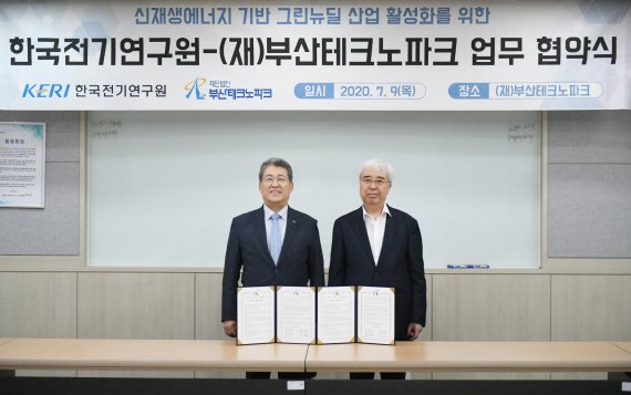 [파이낸셜뉴스] 한국전기연구원(KERI)이 부산테크노파크(부산TP)와 '신재생에너지 기반 그린 뉴딜산업 활성화를 위한 업무협약서'를 체결했다고 10일 밝혔다. 협약식은 양 기관장 및 관계자 20여명이 참석한 가운데 9일 부산TP에서 열렸다.