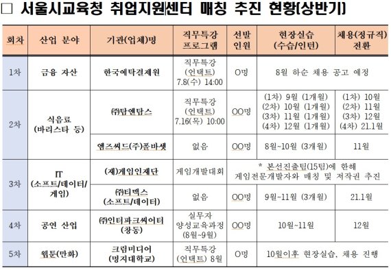 서울시교육청 취업지원센터는 상반기 현재 △금융자산 분야 '한국예탁결제원' △식음료 분야 '탐엔탐스', '엠즈씨드 폴바셋' △IT 분야 '게임인재단', '티맥스' △공연산업 분야 '인터파크씨어터' △웹툰 분야 '크림미디어' 등과 매칭프로그램을 진행하고 있다.
