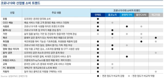 삼정KPMG는 국내 기업들이 코로나19로 인한 새로운 소비 트렌드에 대응하기 위해 Δ디지털 트랜스포메이션 및 언택트 비즈니스 Δ데이터 분석(D&A) 토대의 소비자 이해 Δ디지털 고객경험 분석 및 비즈니스 모델 개발 Δ이해관계자 파트너링 기반 사회적 가치 창출에 기반한 전략을 수립해야 한다고 했다.
