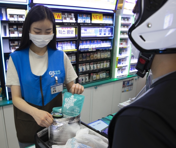 GS25는 아이스크림 배달 서비스를 시작한다고 14일 밝혔다. 배달앱 요기요 또는 카카오톡 주문하기를 통해 아이스크림을 주문하면 GS25가 3개월 동안 테스트한 끝에 개발한 보냉백과 물로 만든 친환경 아이스팩을 이용해 배달하는 서비스를 선보인 것.