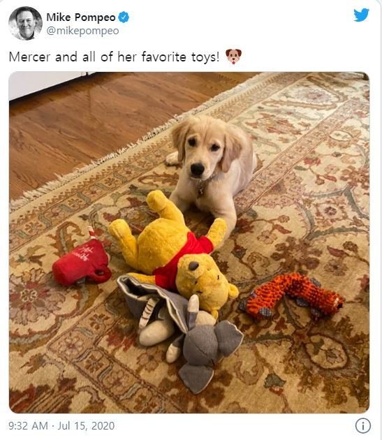 앞서 15일 폼페이오 장관은 자신의 트위터 계정에 반려견과 곰돌이 푸 인형 사진을 올렸다.