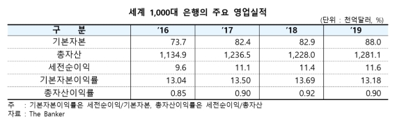 2019년 세계 1000대 은행의 자산, 자본 및 수익 규모는 전년대비 증가했다.