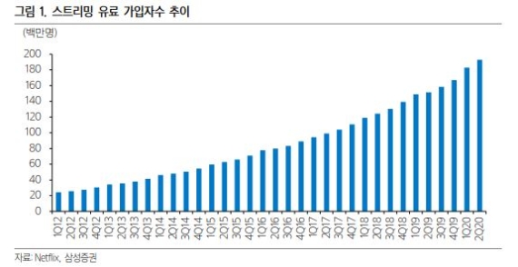 최 연구원은 “코로나로 비대면 활동이 늘어나면서 넷플릭스는 올해 상반기에만 신규 글로벌 유료가입자수 2586만명을 확보하며 이미 지난해 순증(2783만명)에 육박했다”며 “방송, 영화 등 여타 사업에서 타격을 받은 경쟁사 대비 온라인 기반 사업자로서 견조한 영업 성과를 보였고 OTT 선발주자로서 방대한 콘텐츠 라이브러리를 보유하고 있는 점도 경쟁력으로 작용했다”고 설명했다. 그러나 최 연구원은 “시장이 코로나19의 충격에서 조금씩 회복 및 익숙해지고 있어 신규 가입자 증가 속도는 낮아질 것으로 예상돼 하반기 순증 규모는 상반기 수준을 기대하기 어려워 보인다”고 지적했다.