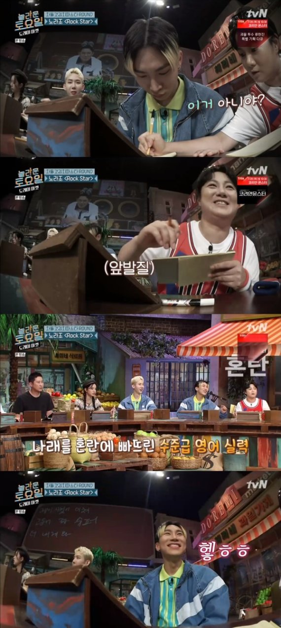 18일 오후 방송된 tvN '놀라운 토요일 도레미 마켓'에서는 조권 서은광이 게스트로 출연, 노라조 '록스타' 받아쓰기에 도전했다.
