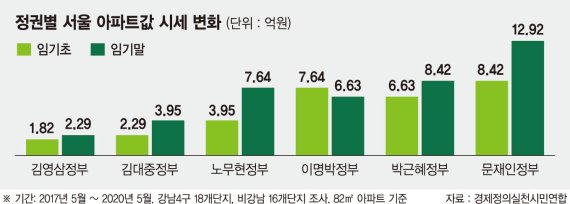 노무현정부 때는 3억9500만원이었던 주요 아파트 가격이 정권 말 94%(3억7000만원) 올라 7억6400만원을 기록했다. 아파트 가격 상승률만 보면 역대 정권 중 노무현정부가 가장 높다. 박근혜정부도 정권 초 6억6000만원에서 정권 말 8억4000만원으로 27%(약 1억7900만원) 상승했다.