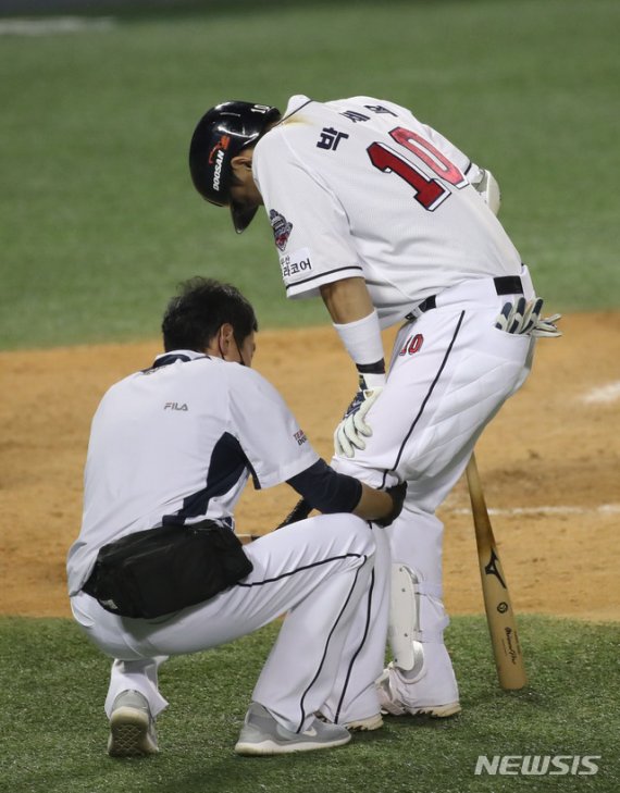 김태형 감독은 "무릎이 약간 부어 있다.