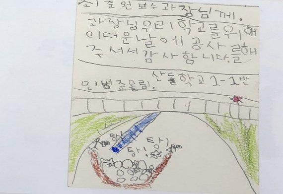 이에 산돌자연학교 어린 학생들은 안전하게 등학교를 할 수 있도록 해준 국토부 직원들에게 감사한 마음을 표현하기 위해 선생님들과 학생들이 홍천국토관리사무소를 직접 방문하여 학부모 감사패 와 학생들이 고사리 손으로 직접 정성을 담아 쓴 감사편지를 전달하였다.