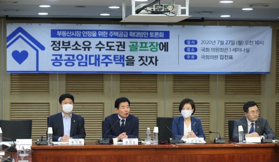 27일 서울 여의도 국회 의원회관에서 열린 '정부 소유 수도권 골프장에 공공임대주택을 짓자' 토론회에서 더불어민주당 김진표 의원은 "3기 신도시는 아직 토지 매입이 끝나지 않았고, 과거의 경험상 조성되기까지 5~10년 가량 걸릴 것"라며 "군 골프장을 활용하면 부지매입, 택지 조성, 배수 및 도로시설 확충에 들어가는 시간을 대폭 줄일 수 있다"고 말했다. 김 의원은 이번 수도권 공급대책 일환으로 군이 소유한 태릉골프장 개발방안을 처음으로 제기한 바 있다.