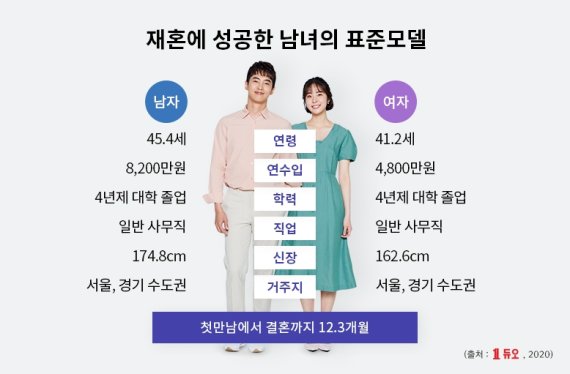 듀오의 재혼 남성 표준모델은 △45.4세 △연소득 8200만원 △4년제 대졸 △신장 174.8cm △일반 사무직이다. 재혼 여성 표준모델은 △41.2세 △연소득 4800만원 △4년제 대졸 △신장 162.6cm △일반 사무직으로 조사됐다. 듀오 성혼회원의 평균 재혼 연령은 남성 45.4세, 여성 41.2세이다. 통계청이 발표한 평균 재혼 나이(2019년 남 49.6세, 여 45.2세)보다 남녀 각각 4.2세, 4세씩 낮다.